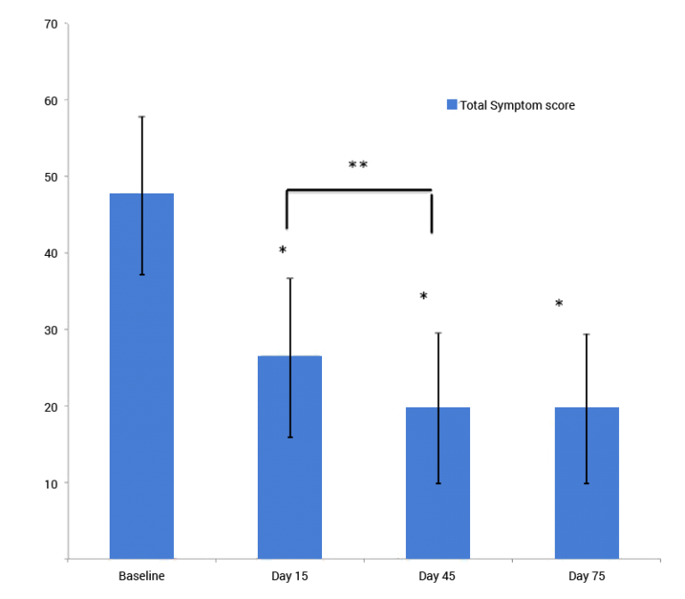 Notes: The total score of the 10 single symptoms were defined as the total symptom scores. (Dryness, Foreign body sensation, Itching, Burning, Visual Fatigue, Blurred Vision, Sensitivity to light, Watering, Secretion disturbance, Pain). *Compared to the baseline, the total symptom score significantly decreased at the time of D15, D45 and D75 (P<0.01). **Between the visits of D15 and D45, the total score continuously decreased (P<0.01), while between the visits of D45 and D75, no significant difference was observed (P=0.85).