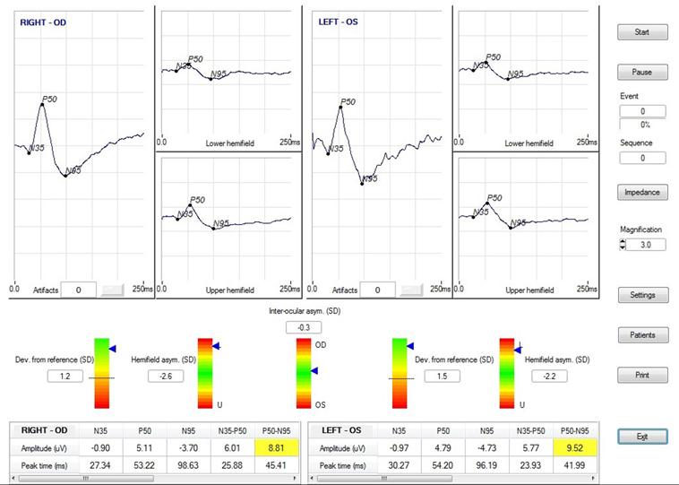 The Glaucoma Hemifield PERG Test shows the dysfunctions of the Retinal Ganglion cells before the irreversible apoptosis process starts. The test is very fast and provides a comparative analysis of the functionality of the upper and lower retinal hemifields. The analysis or the intraindividual variability of the PERG test allows the reduction of the results variability because the test is not affected by external variability sources.