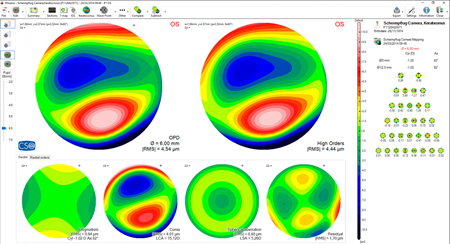 Aberrometric analysis offers a complete overview of the corneal aberrations. It is possible to select the contribution of the anterior, posterior or total cornea for different pupil diameters. The OPD/WFE maps and the visual simulations (PSF, MTF, image convolution with optotype) can help the clinician in understanding or explaining the patient’s visual problems.